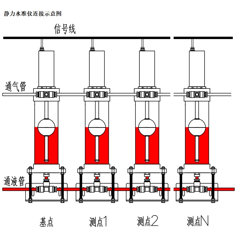 磁致伸縮式靜力水準儀是由一個高精度的磁致伸縮液位計,加上儲液罐、液位浮子、保護罩、調平支架、聯通氣管水管等部件組成。